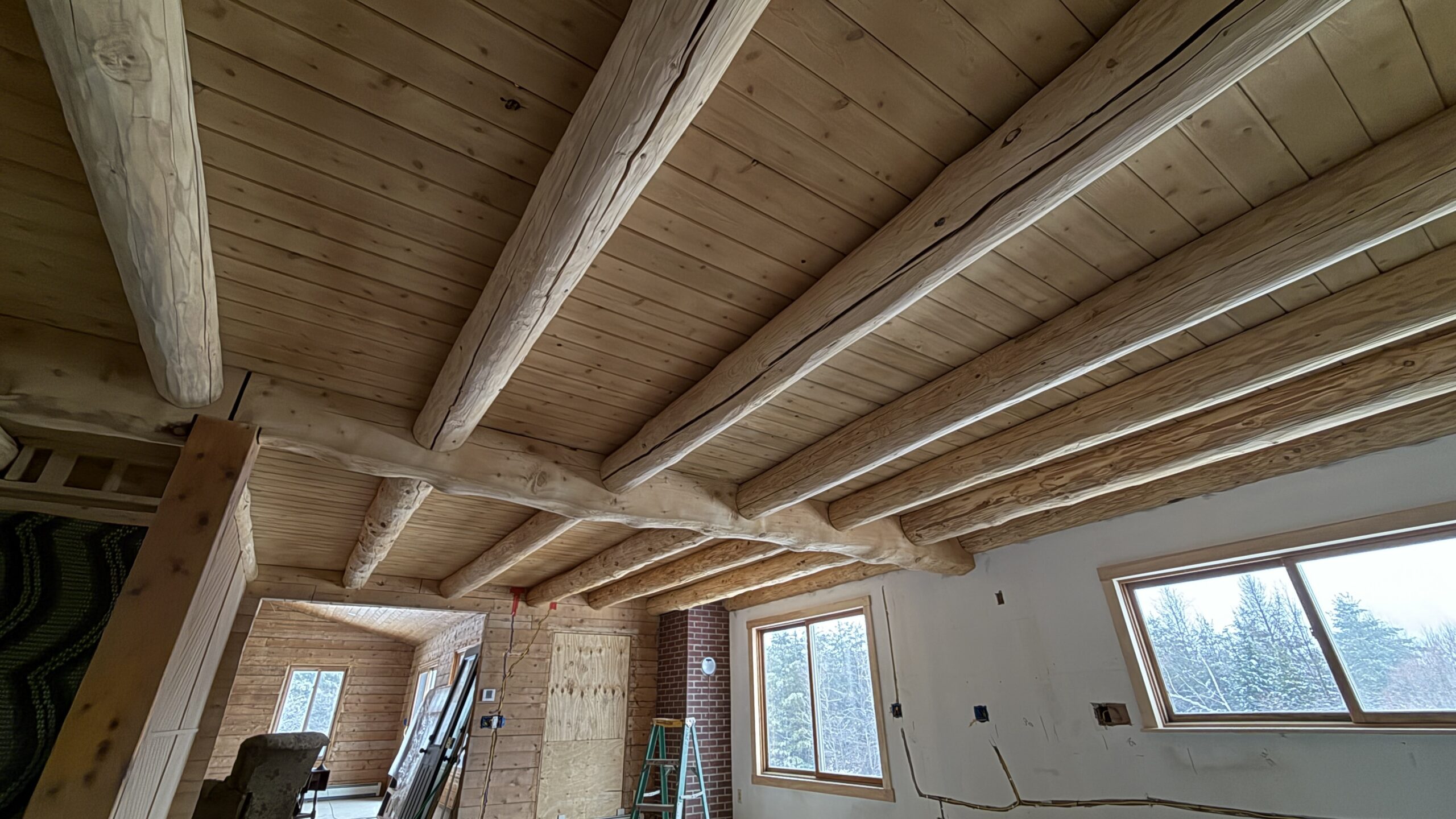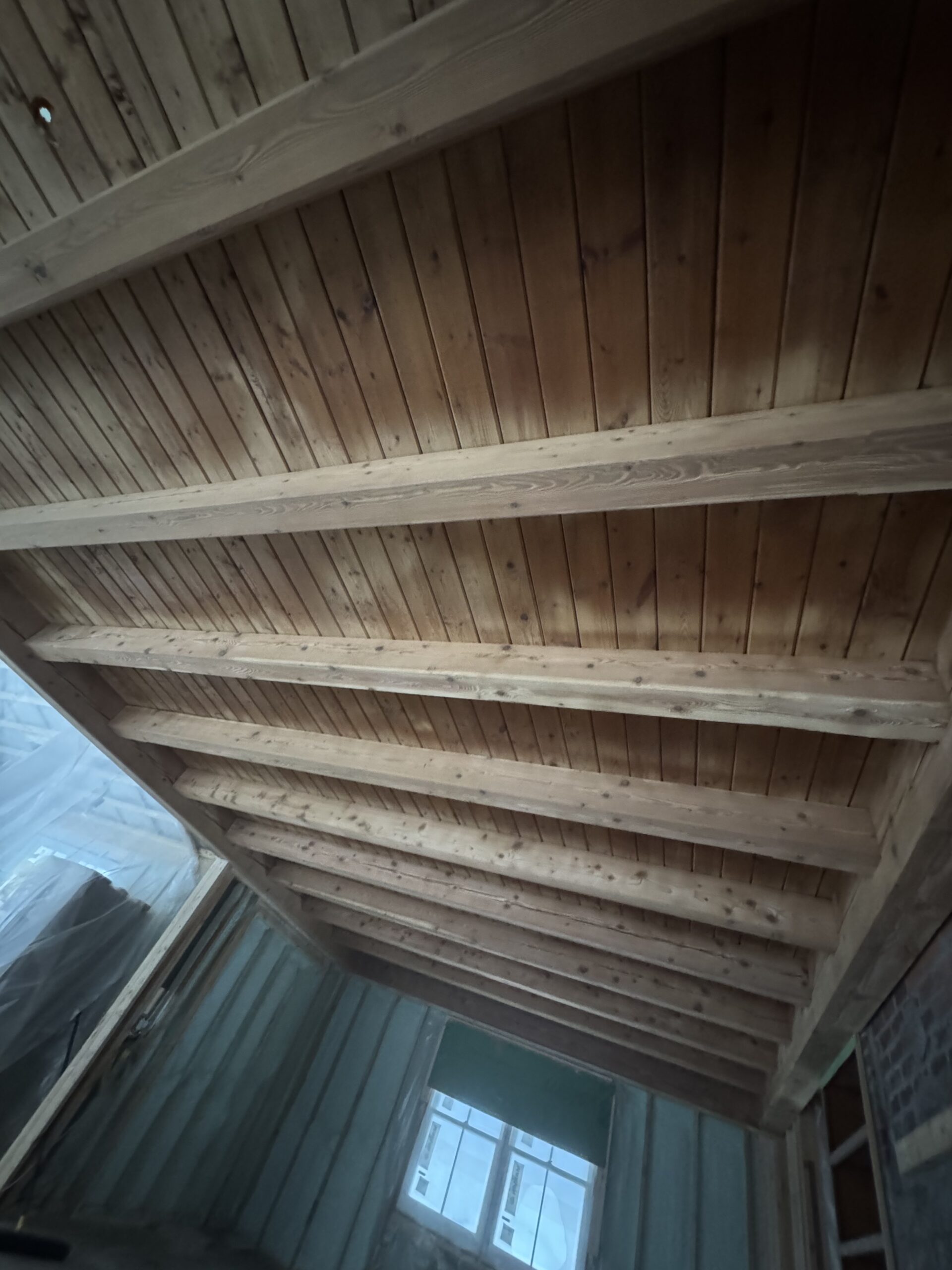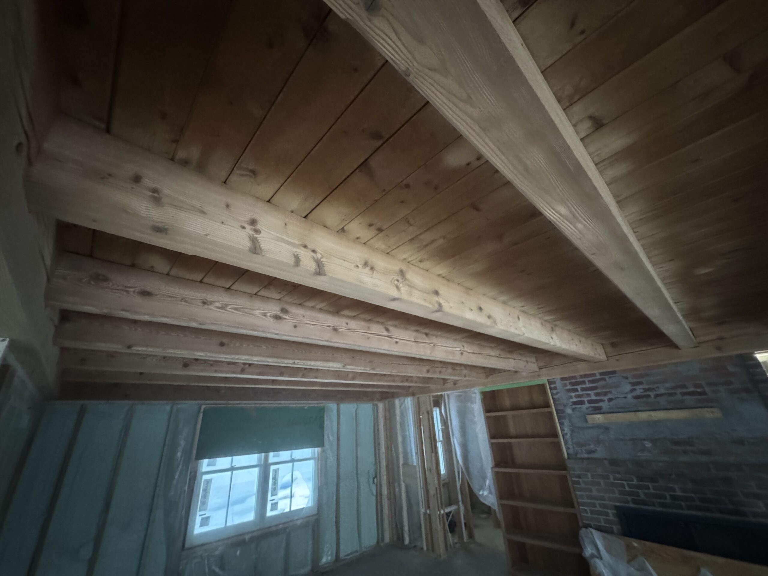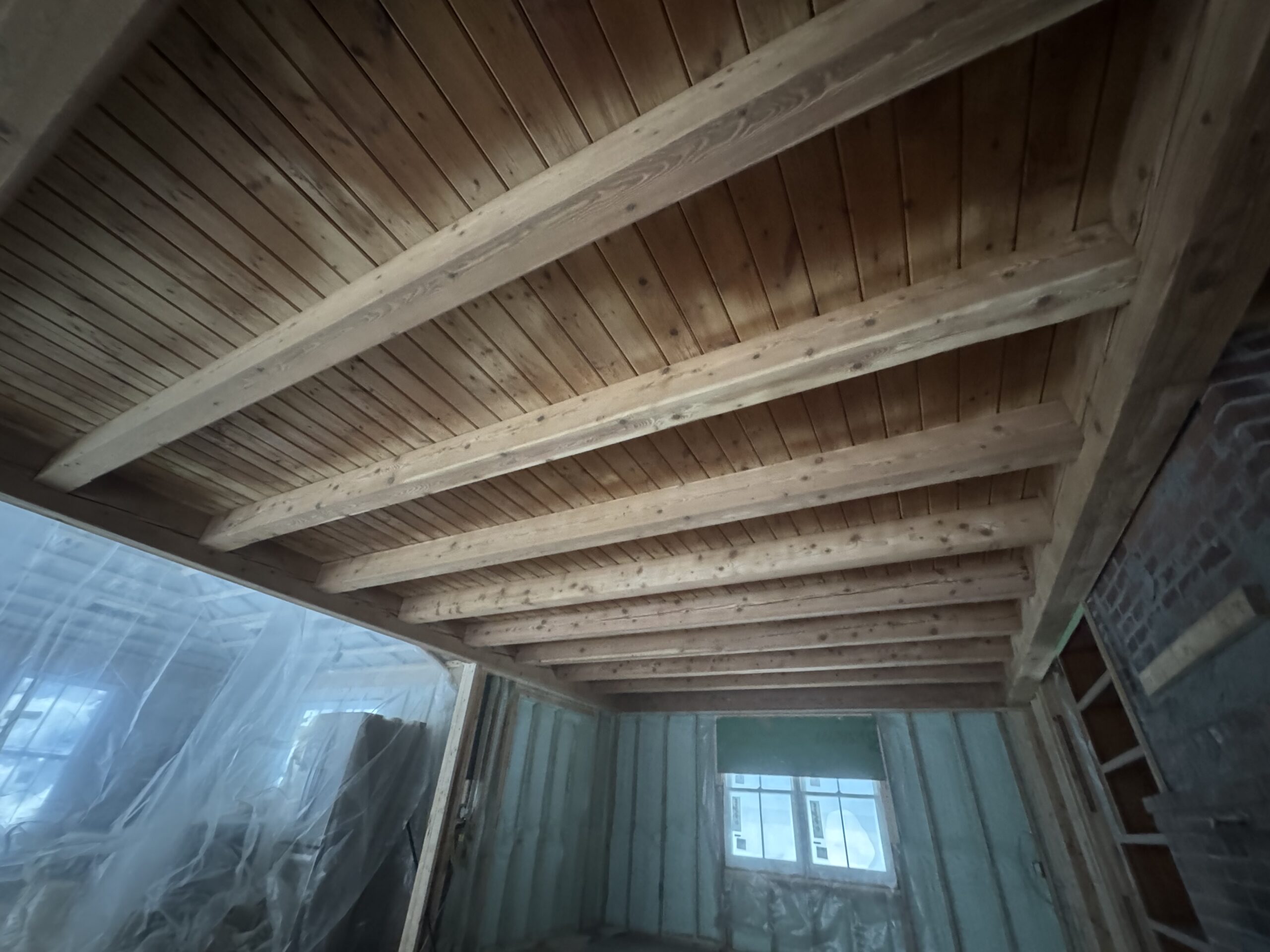 Ceiling wood beams sandblasted by Green Mountain Mobile Sandblasting and Powder Coating in Stowe Vermont with T&G sections left untouched