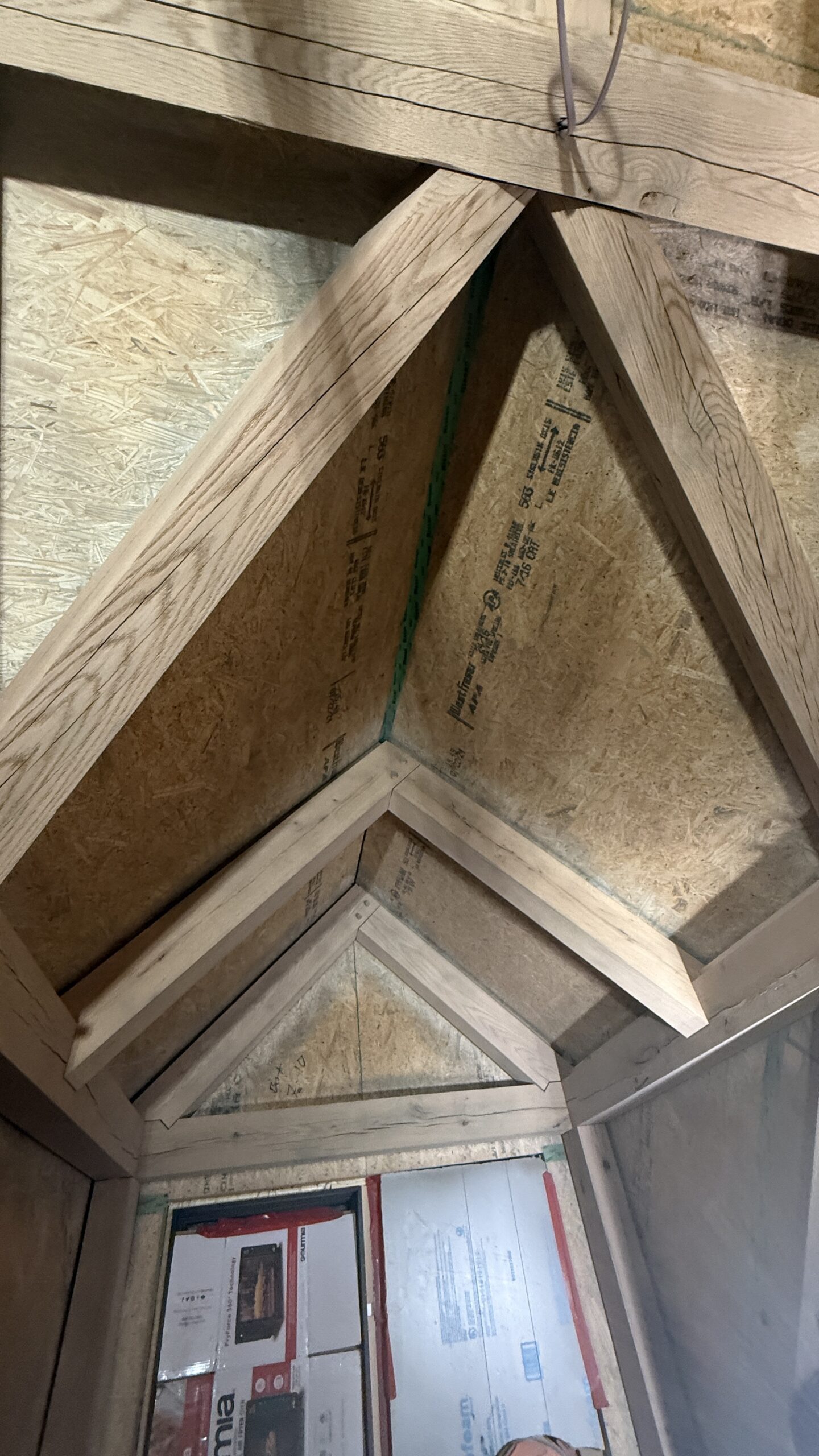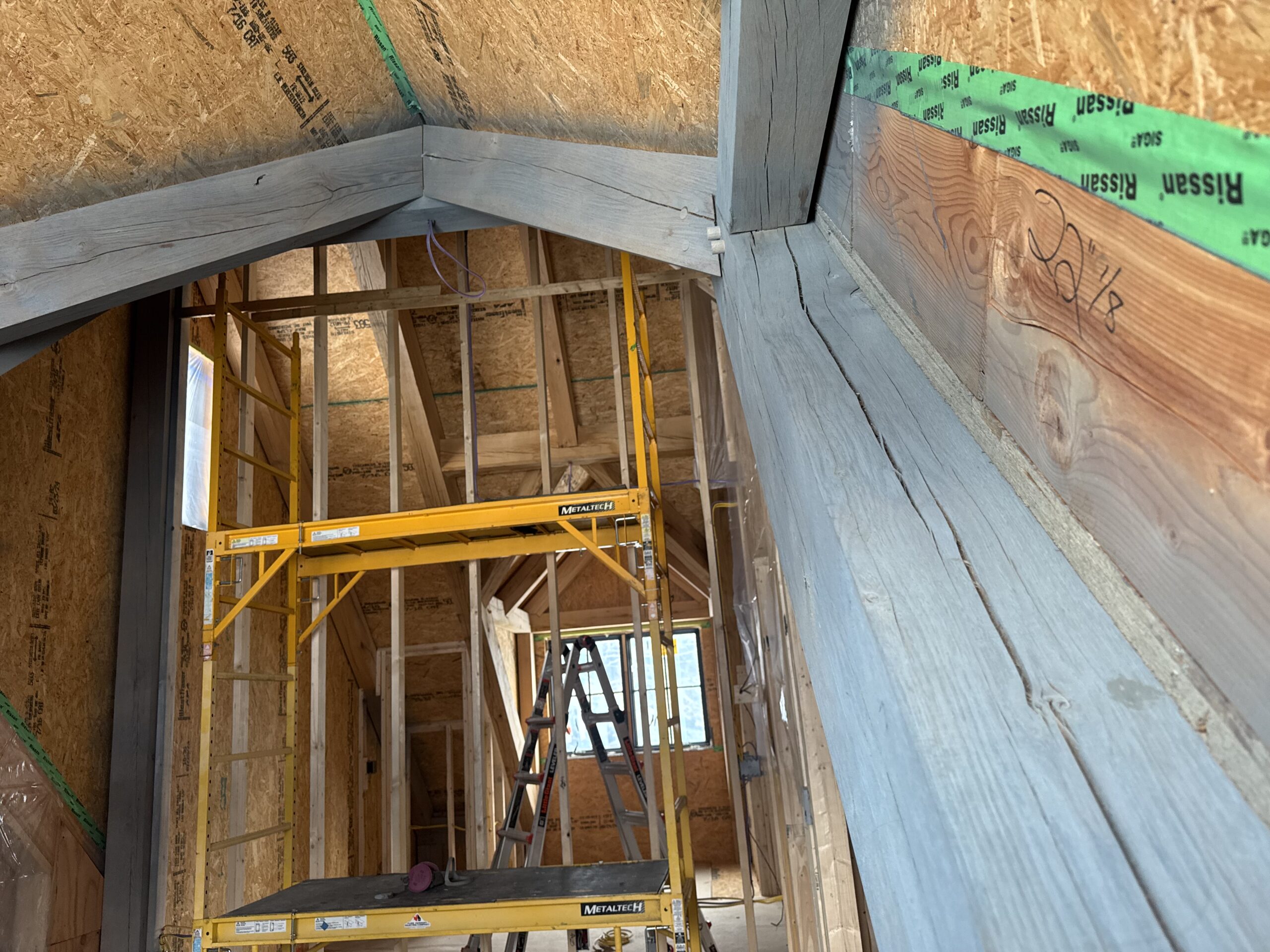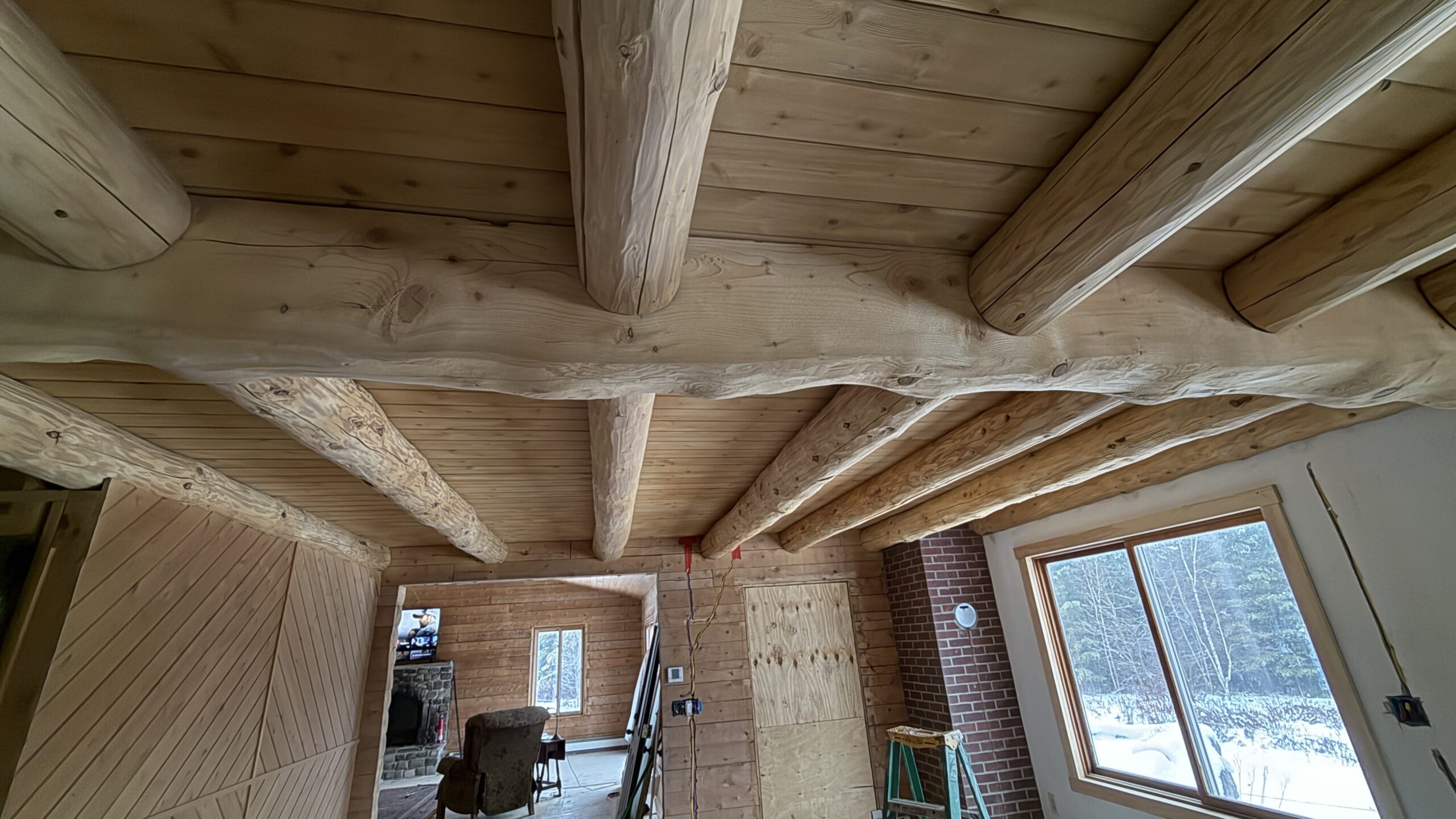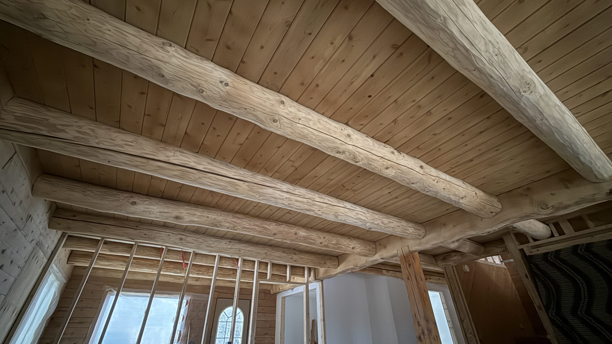 Ceiling wood beams sandblasted by Green Mountain Mobile Sandblasting and Powder Coating in Stowe Vermont with T&G sections left untouched