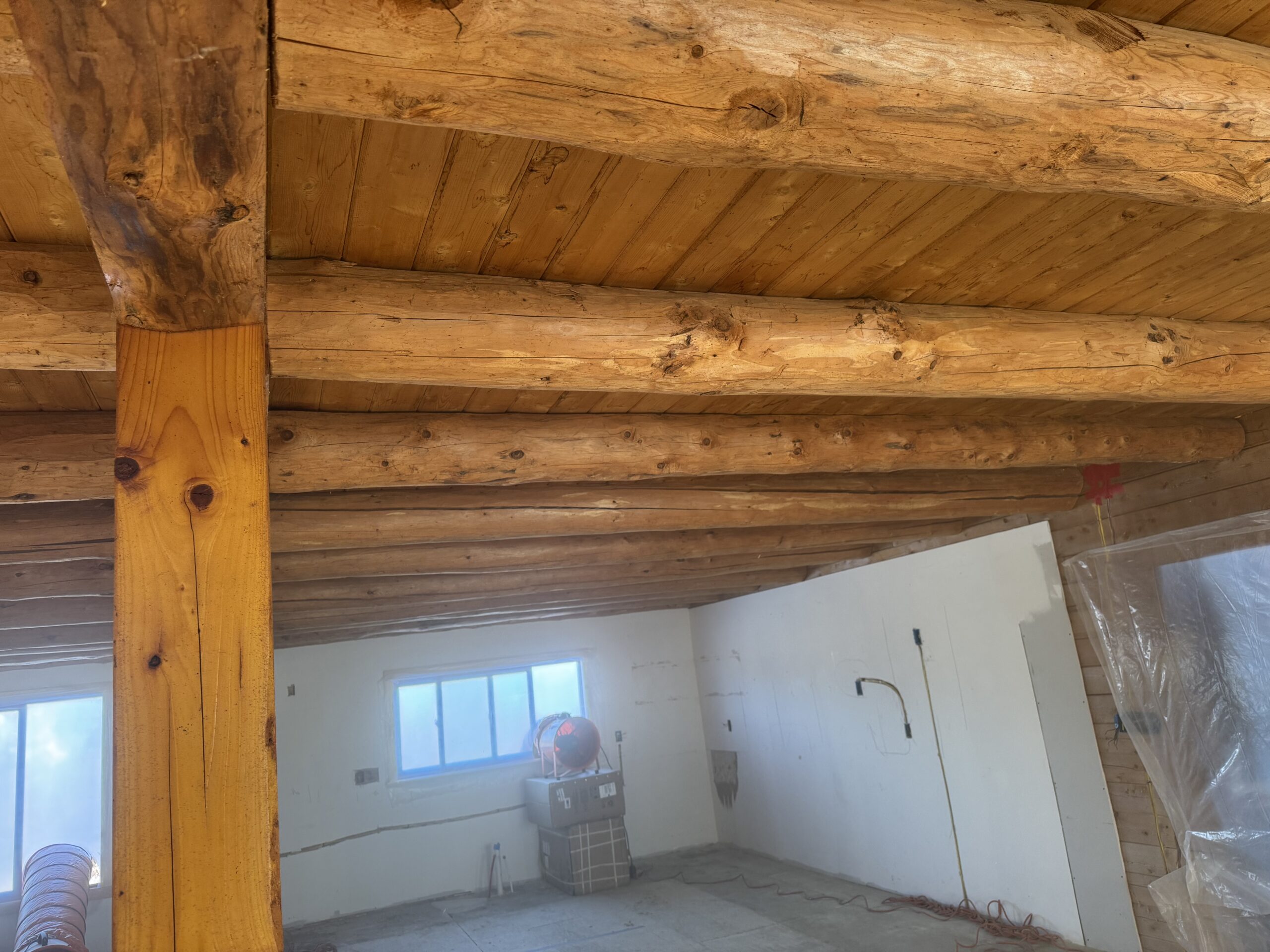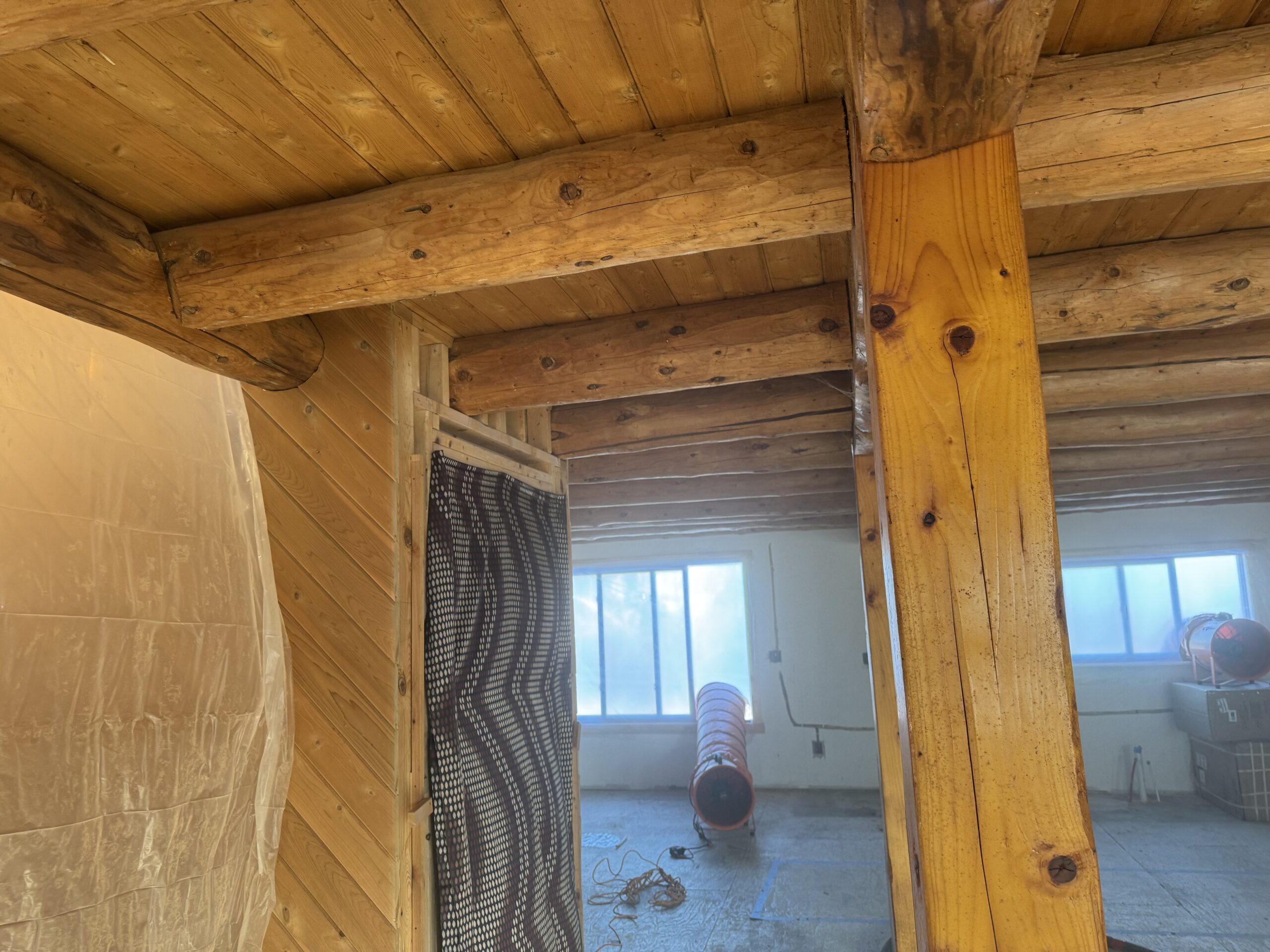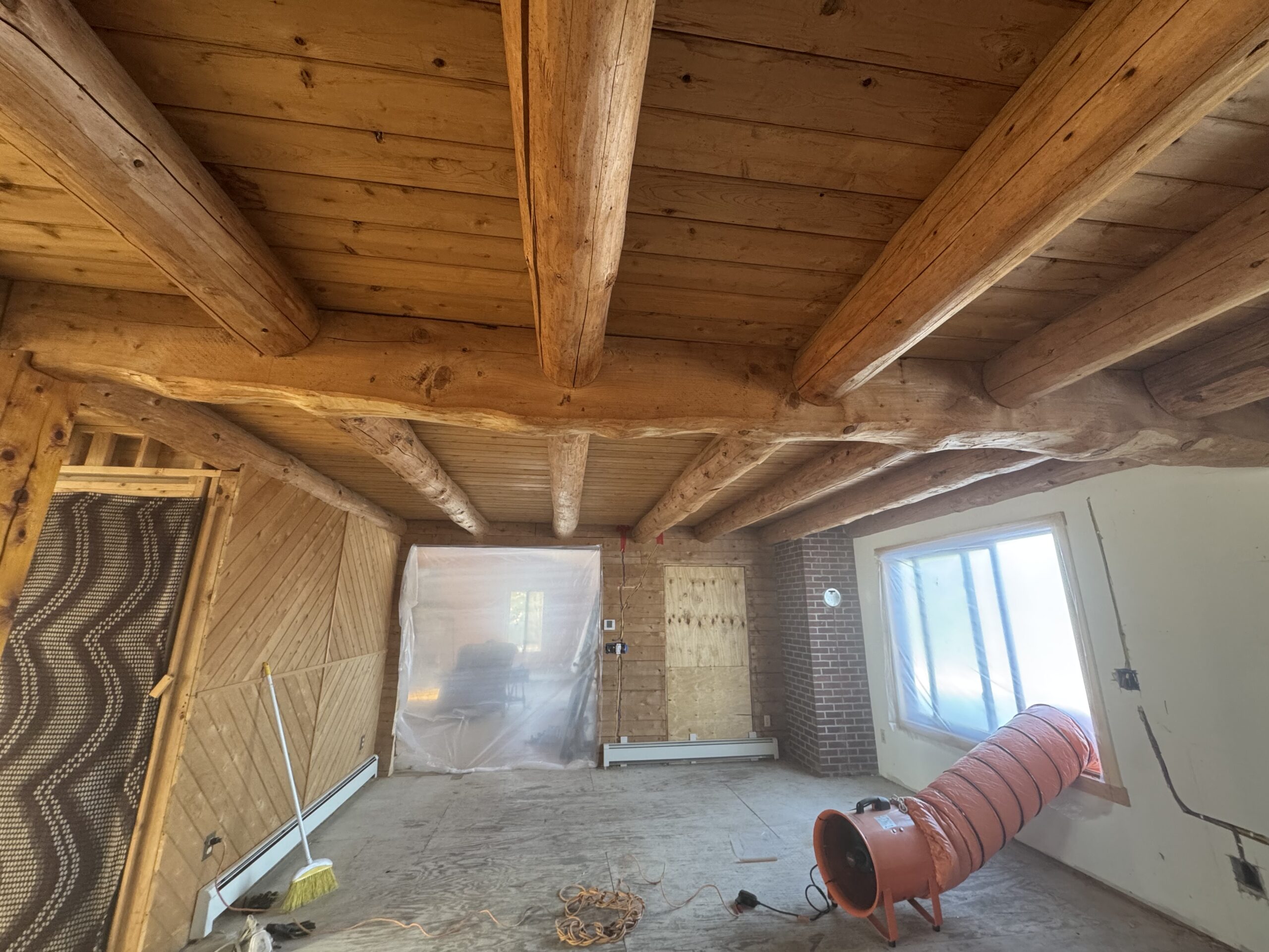 Interior beams sandblasted by Green Mountain Mobile Sandblasting and Powder Coating in off-grid Elmore Vermont home to remove unwanted stain