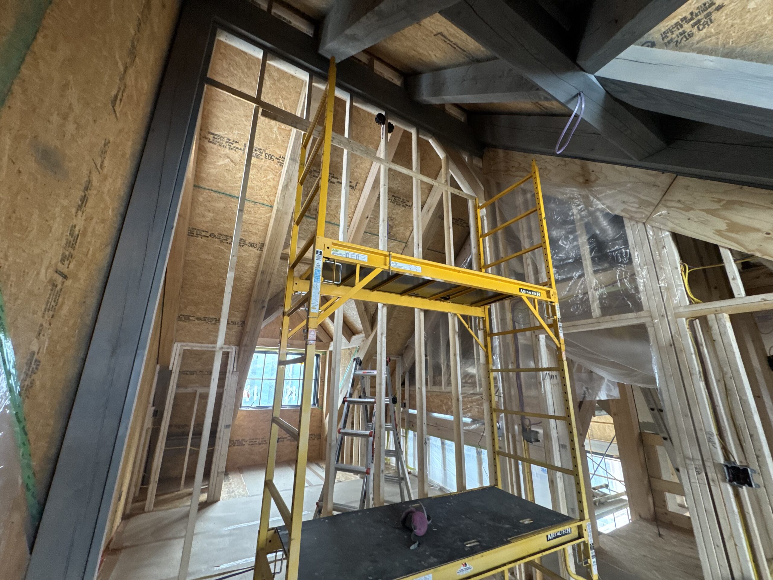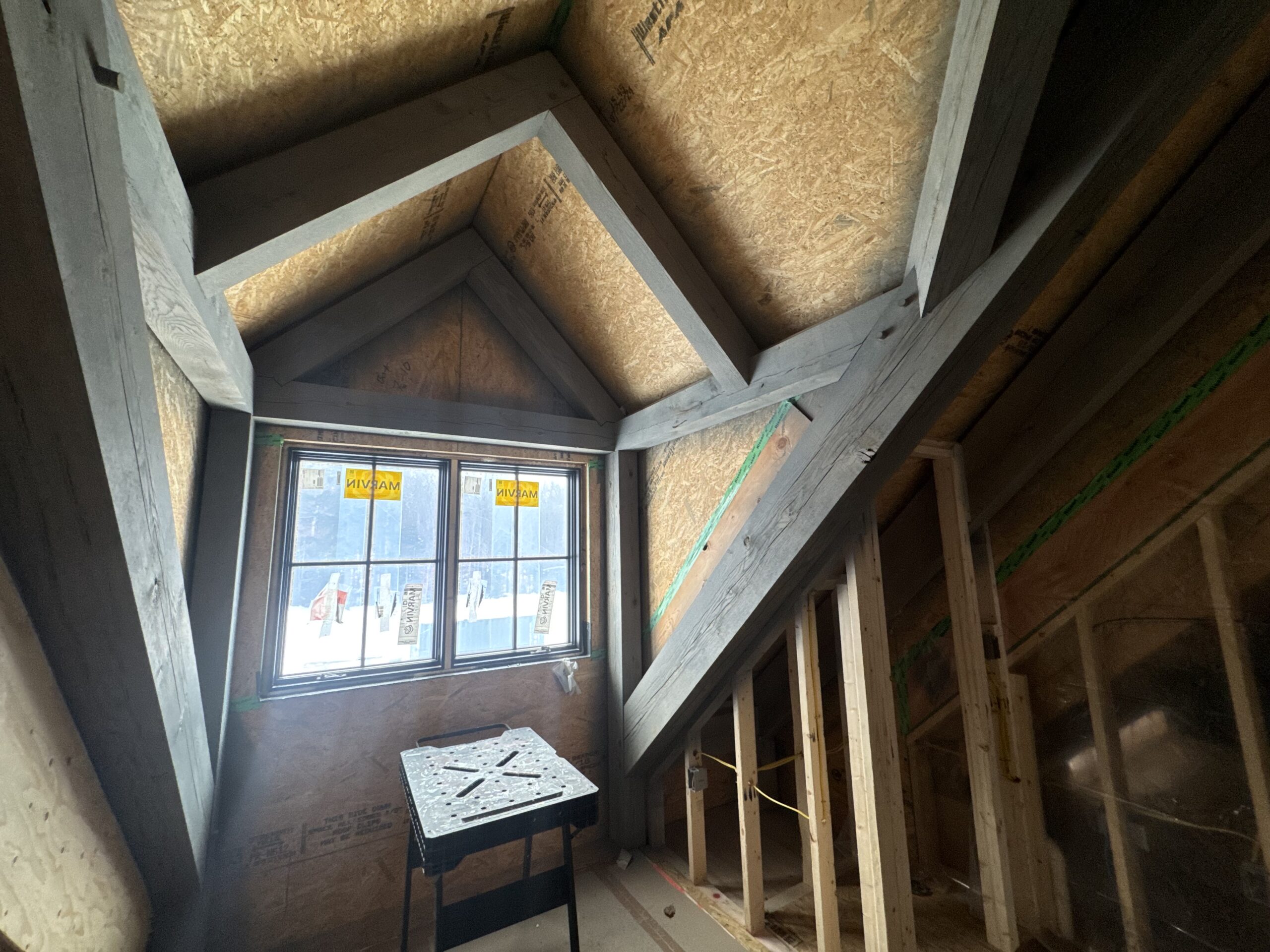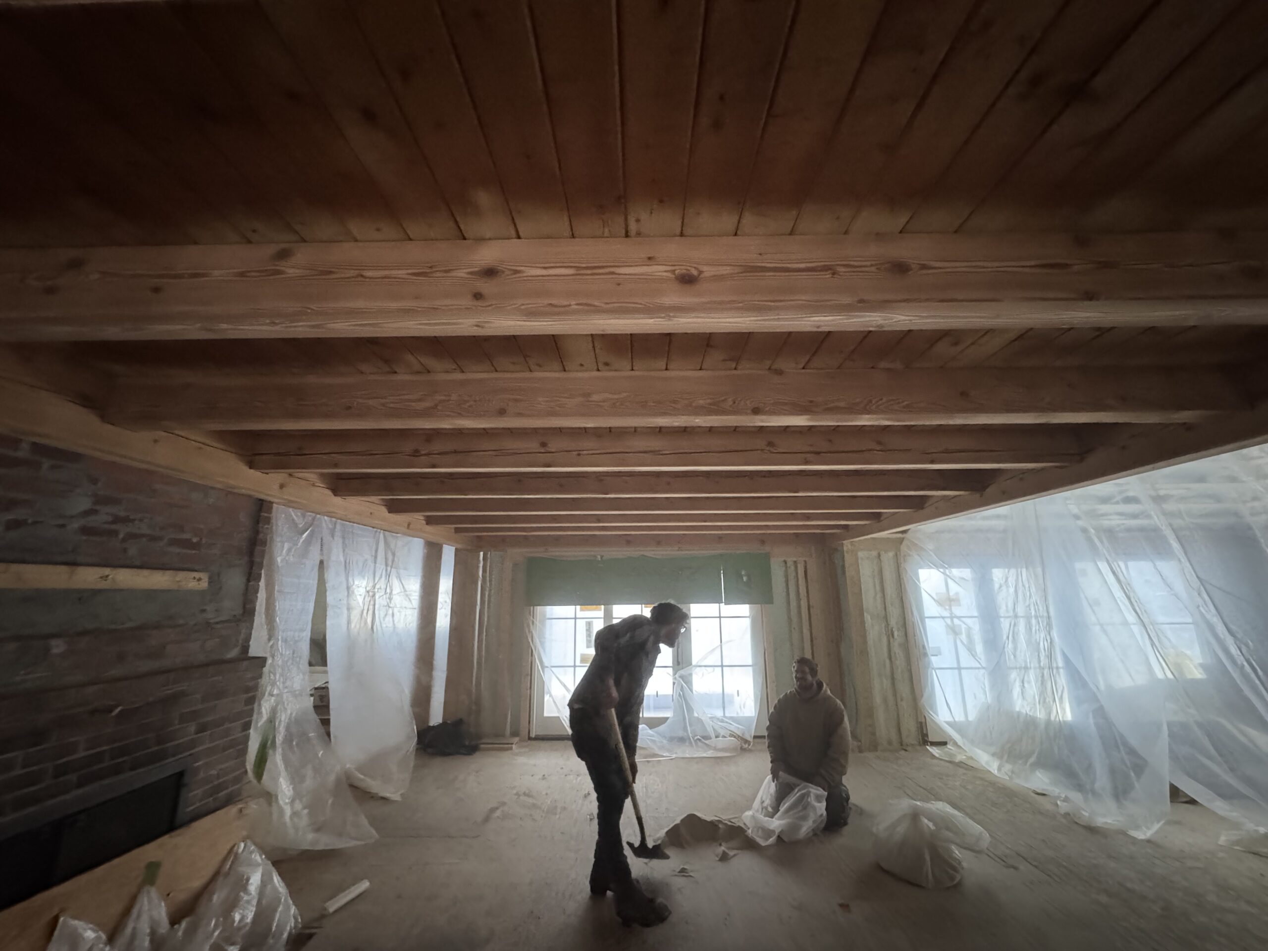 Interior beams sandblasted by Green Mountain Mobile Sandblasting and Powder Coating in off-grid Elmore Vermont home to remove unwanted stain